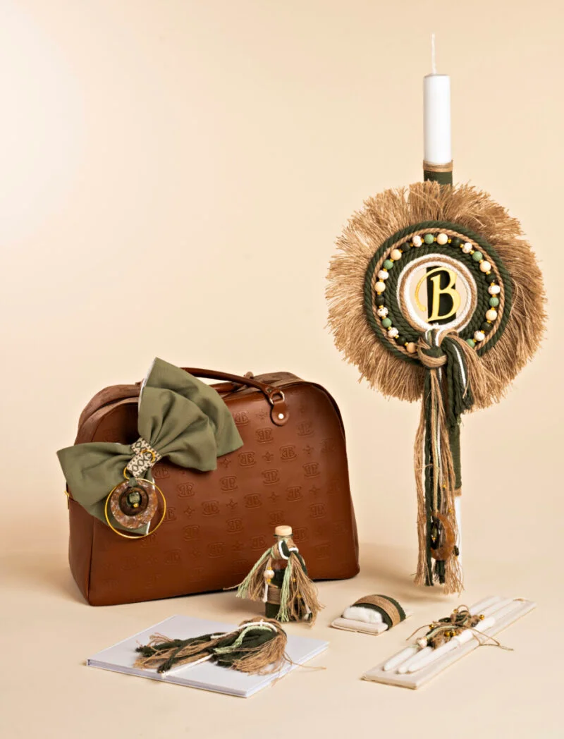 Τσάντα από δερματίνη με το λογότυπο της εταιρείας μας, σε ταμπά απόχρωση με petit στολισμό, με υφάσματα και στοιχεία από φίλντισι. Λαμπάδα στα ίδια χρώματα με στρογγυλό στεφάνι και μονόγραμμα της επιλογής σας. Σετ λαδιού και ευχολόγιο ασορτί.