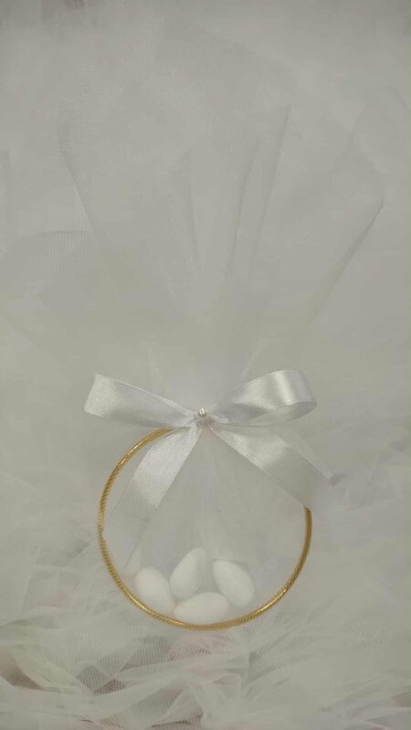 Μπομπονιέρα γάμου με μεταλλικό χρυσό στεφάνι λευκό τούλι.