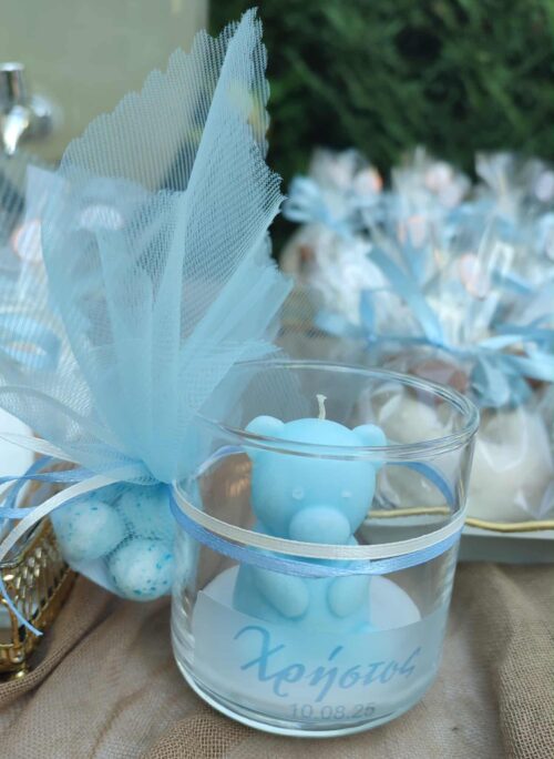 Μπομπονιέρα αρκουδάκι  μέσα σε ποτήρι. Το αρκουδάκι μπορεί να γίνει σε χρώμα εκρού, βεραμάν, λευκό, ροζ, , γκρι.