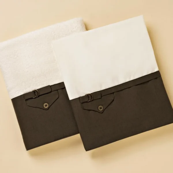 Βαμβακερά λαδόπανα σε ιβουάρ χρώμα με φάσα χακί και ιδιαίτερο δέσιμο . Τα λαδόπανα περιλαμβάνουν μεγάλη πετσέτα και σεντόνι , πετσέτα μικρή και εσώρουχα .