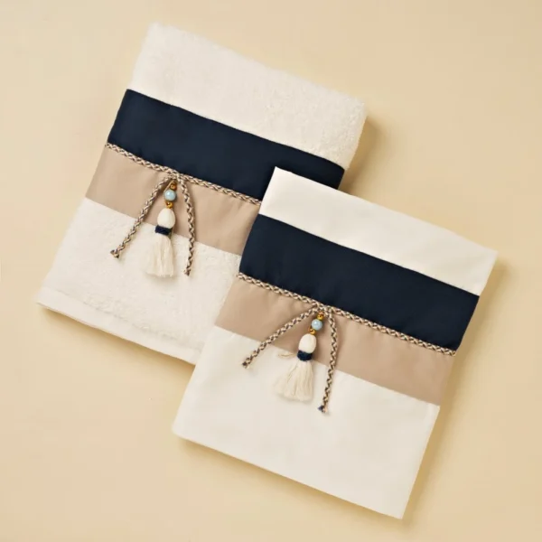 Βαμβακερά λαδόπανα σε ιβουάρ χρώμα με φάσα στο τελείωμα χακί και ιδιαίτερο σχέδιο με ιμάντα. Τα λαδόπανα περιλαμβάνουν μεγάλη πετσέτα και σεντόνι , πετσέτα μικρη και εσώρουχα .