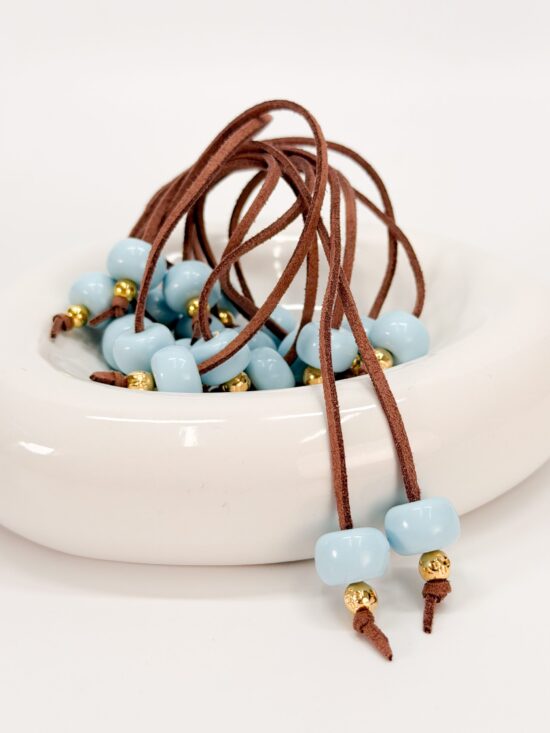 Μαρτυρικό κομπολόι με καφέ σουέτ κορδόνι ,γαλάζια χάντρα και επιχρυσωμένο σταυρό.