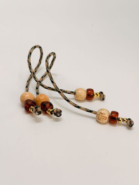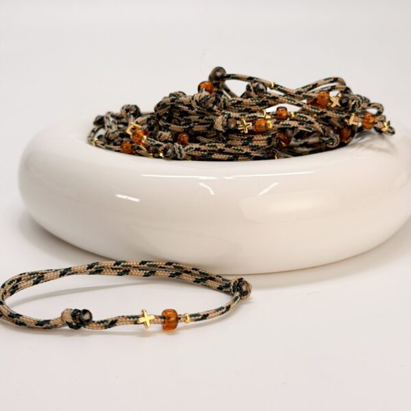 Μαρτυρικό κομπολόι με κορδόνι σε 3 αποχρώσεις, ξύλινο σταυρό και χάντρα και καφέ χάντρες.