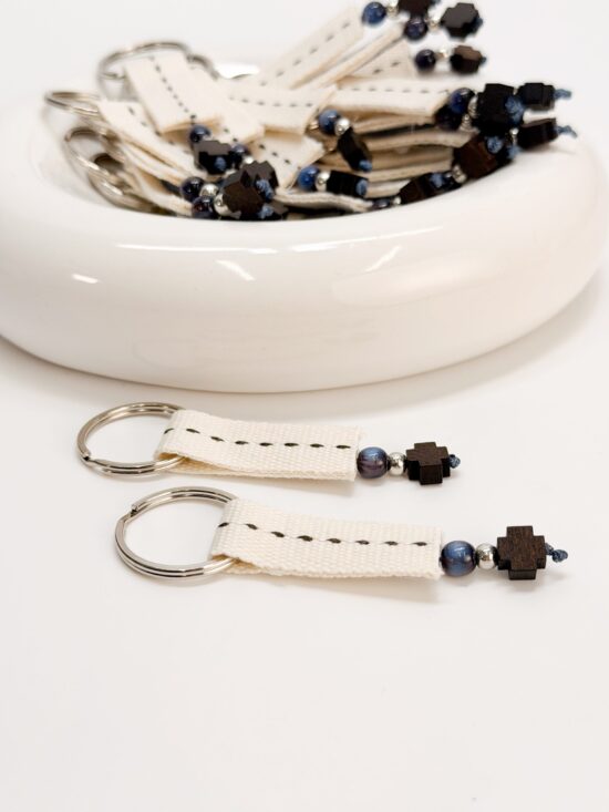Μαρτυρικό μπρελόκ με εκρού τρέσα, ξύλινο σταυρό, μπλε χάντρα και ασημί στοιχεία.