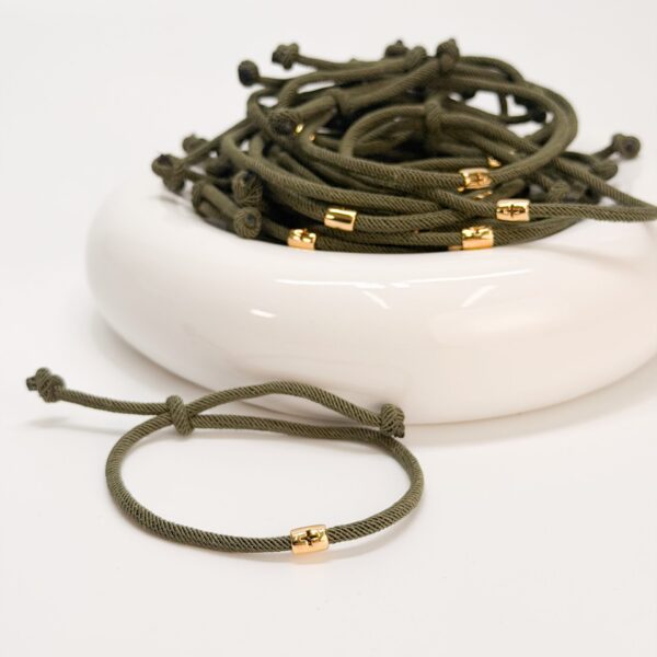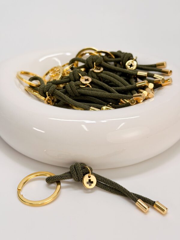 Μαρτυρικό μπρελοκ με χακί κορδόνι,επιχρυσωμένο σταυρό και τάπες.