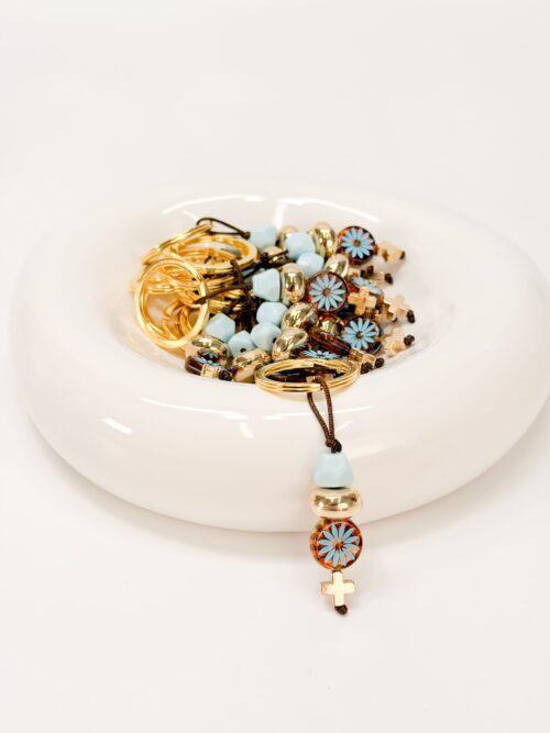 Μαρτυρικό μπρελόκ με καφέ κορδόνι, γαλάζια ακρυλική χάντρα, χρυσή ροδέλα μεγάλη, ακρυλική στρογγυλή χάντρα με λουλούδι σε καφέ και γαλάζια απόχρωση και ακρυλικό σταυρό.