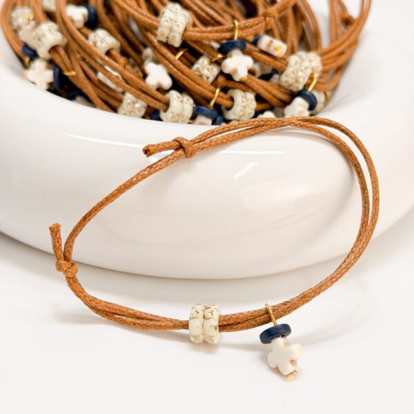 Μαρτυρικό μπρελόκ σε ασημί απόχρωση, με δίχρωμη τρέσα, μπλε ροδέλα και σταυρό χαολίτη.