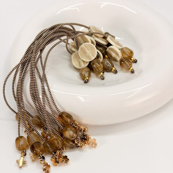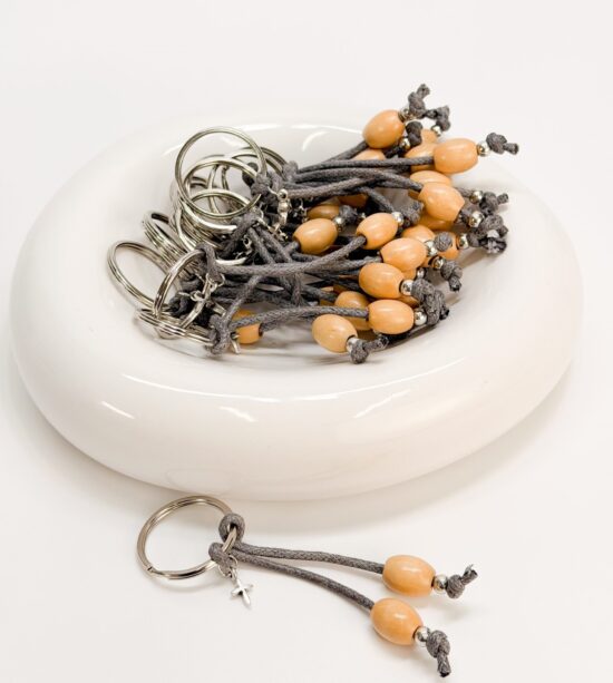 Μαρτυρικό μπρελόκ με στοιχεία σε ασημί απόχρωση, ξύλινες χάντρες, γκρι κορδόνι και σταυρό.