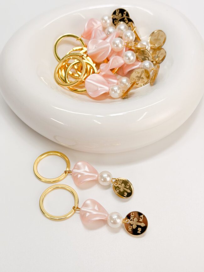 Μαρτυρικό μπρελόκ με πέρλα, πέταλο λουλουδιού και χρυσό plexiglass κωνσταντινάτο σταυρό.