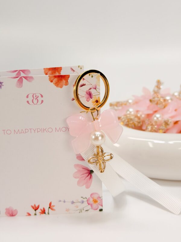 Μαρτυρικό μπρελόκ με χάντρα φιογκάκι, πέρλα και σταυρό σε σχήμα λουλουδιού.