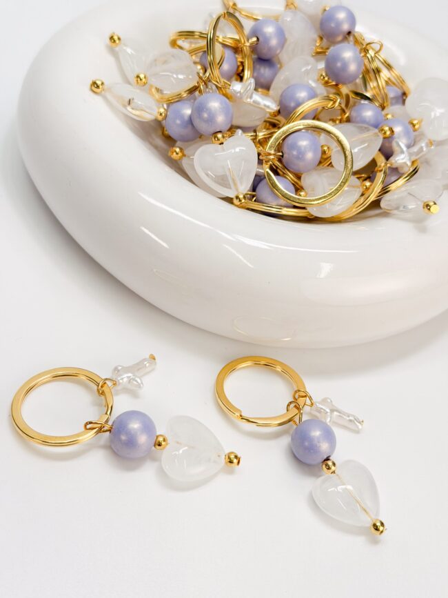 Μαρτυρικό μπρελόκ με περλέ σταυρό, λιλά χάντρα και μοτιφ καρδιά ακρυλική.