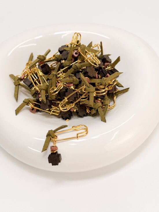 Μαρτυρικό πέτο με χακί σουετ,καφέ ξύλινο σταυρό και κεραμική ροδέλα.