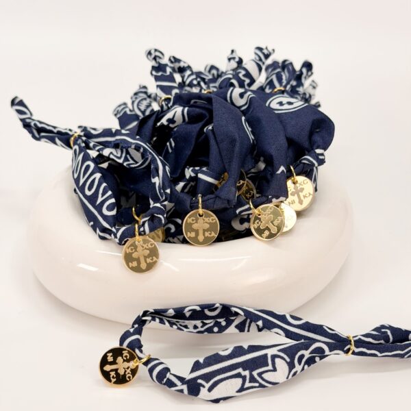 Μαρτυρικό πέτο με δίχρωμη τρέσα σε μπλε-άσπρη απόχρωση, μπλε μάτι και plexiglass σταυρό κωνσταντινάτο.