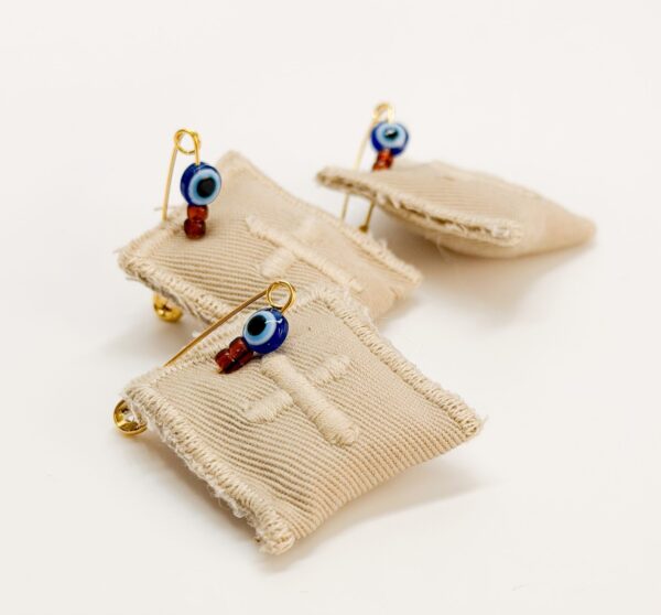 Μαρτυρικό πέτο μαξιλαράκι με μπεζ τρέσα, κεντητό σταυρό, ματάκι και χάντρες.