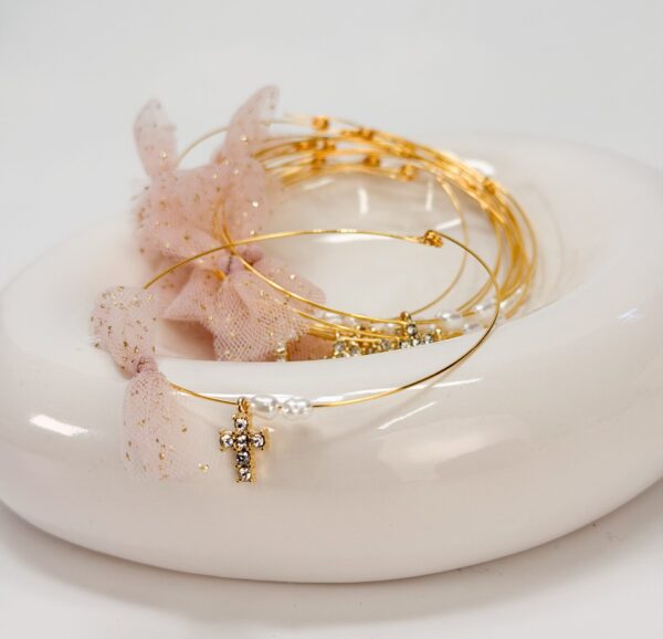 Μαρτυρικό βραχιόλι με memory wire,πέρλες,φιογκάκι με τρέσα σε ροζ απόχρωση και χρυσά flakes και επιχρυσωμένο σταυρό με στρας.