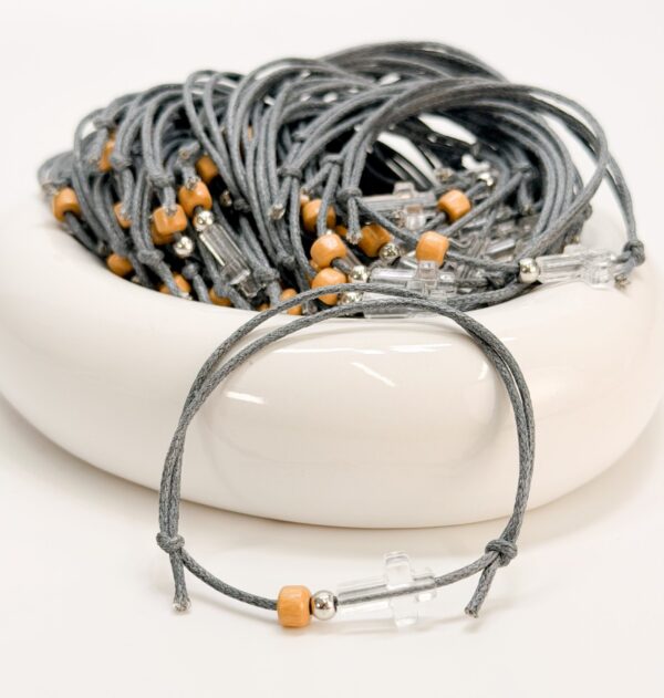 Μαρτυρικό βραχιόλι με γκρι κορδόνι, διάφανο ακρυλικό σταυρό και ξύλινη χάντρα.