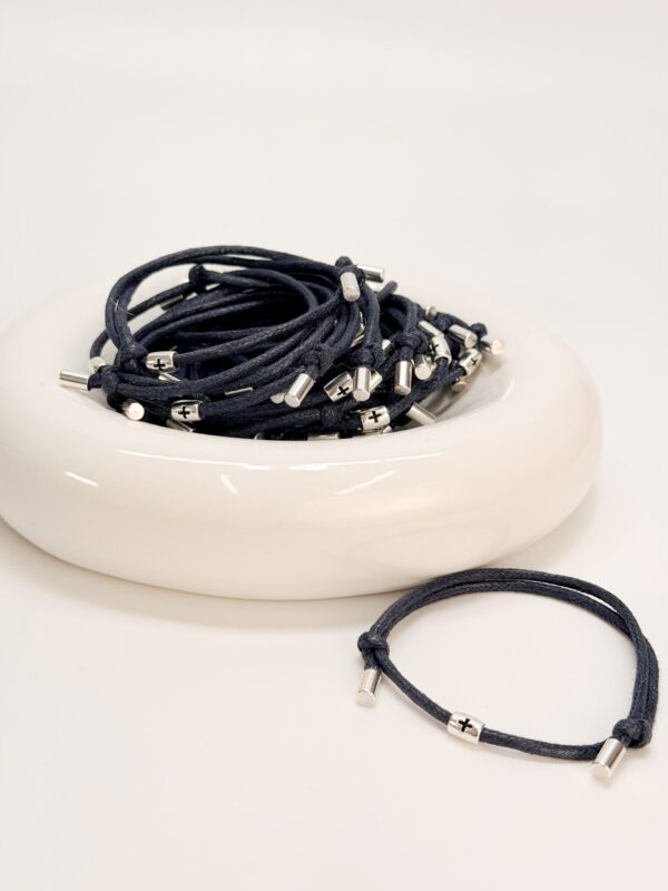 Μαρτυρικό βραχιόλι με μπλε κορδόνι, σταυρό και τάπες σε ασημί απόχρωση.