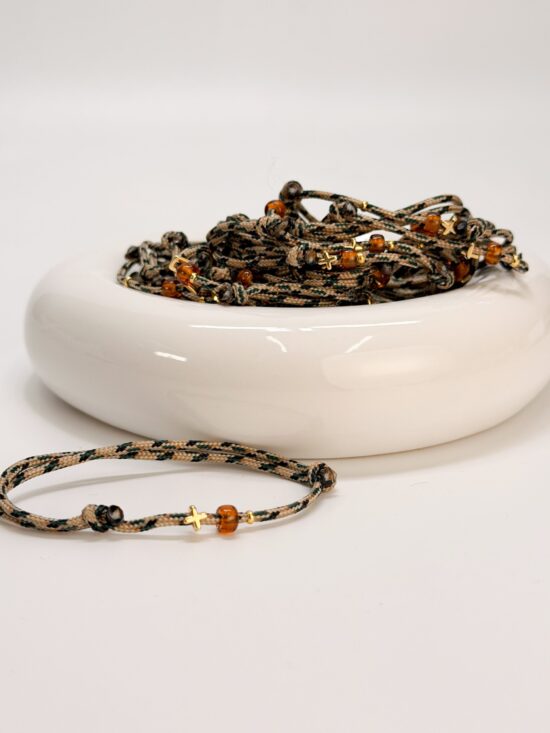 Μαρτυρικό βραχιόλι με κορδόνι σε 3 αποχρώσεις, καφέ ακρυλική χάντρα και επιχρυσωμένο σταυρό.