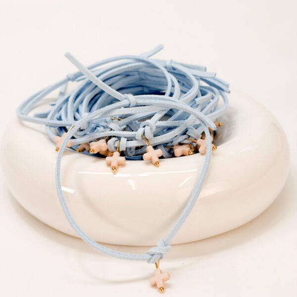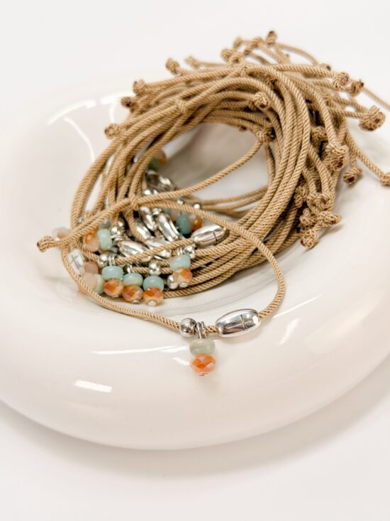 Μαρτυρικό βραχιόλι με μπεζ κορδόνι, δίχρωμη βεραμάν χάντρα, ασημί χάντρα, κρύσταλλο και σταυρό σε ασημί απόχρωση.