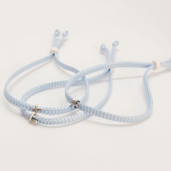 Μαρτυρικό βραχιόλι με δίχρωμο γαλάζιο, άσπρο κορδόνι παπουτσιού, λευκή κεραμική ροδέλα, σταυρό και χάντρα σε ασημί απόχρωση.