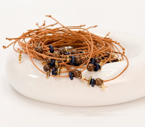 Μαρτυρικό βραχιόλι με καφέ κερωμένο κορδόνι, χάντρα αιματίτη, ξύλινη χάντρα, μπλε ροδέλα κεραμική και επιχρυσωμένο σταυρό.