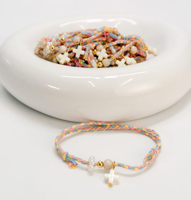 Μαρτυρικό βραχιόλι με πολύχρωμο κορδόνι, ακρυλικό σταυρό και χάντρες.