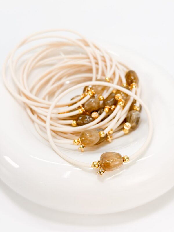 Μαρτυρικό βραχιόλι με εκρού καουτσούκ κορδόνι, καφέ δίχρωμη ακρυλική πέτρα και επιχρυσωμένο σταυρό.
