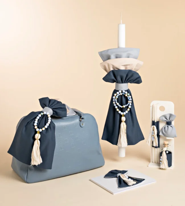 Τσάντα δερματίνη σε dusty blue απόχρωση, με υφασμάτινο στολισμό και ένα ιδιαίτερο στοιχείο από χάντρες, σιέλ και λευκές. Λαμπάδα από πλούσια υφάσματα στις ίδιες αποχρώσεις και το ίδιο διακοσμητικό στοιχείο με μεγάλη βαμβακερή φούντα στο τελείωμα. Σετ λαδιού σε βάση και ευχολόγιο ασορτί.
