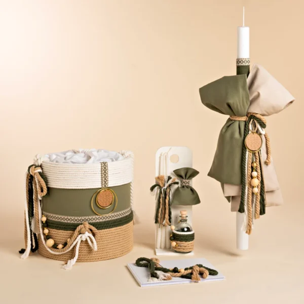 Υφασμάτινα λουλούδια, φυσικά pampas και κορδόνια σε μπλε σιέλ και σπαγγί χρωματισμούς, ξύλινο στρογγυλό καλάθι με πλούσια σύνθεση από λουλούδια. Ασορτί λαμπάδα με μεγάλο μονόγραμμα Plexiglass της επιλογής σας. Σετ λαδιού σε ξύλινη βάση και βιβλίο ευχών ολοκληρώνουν το πακέτο αυτό.