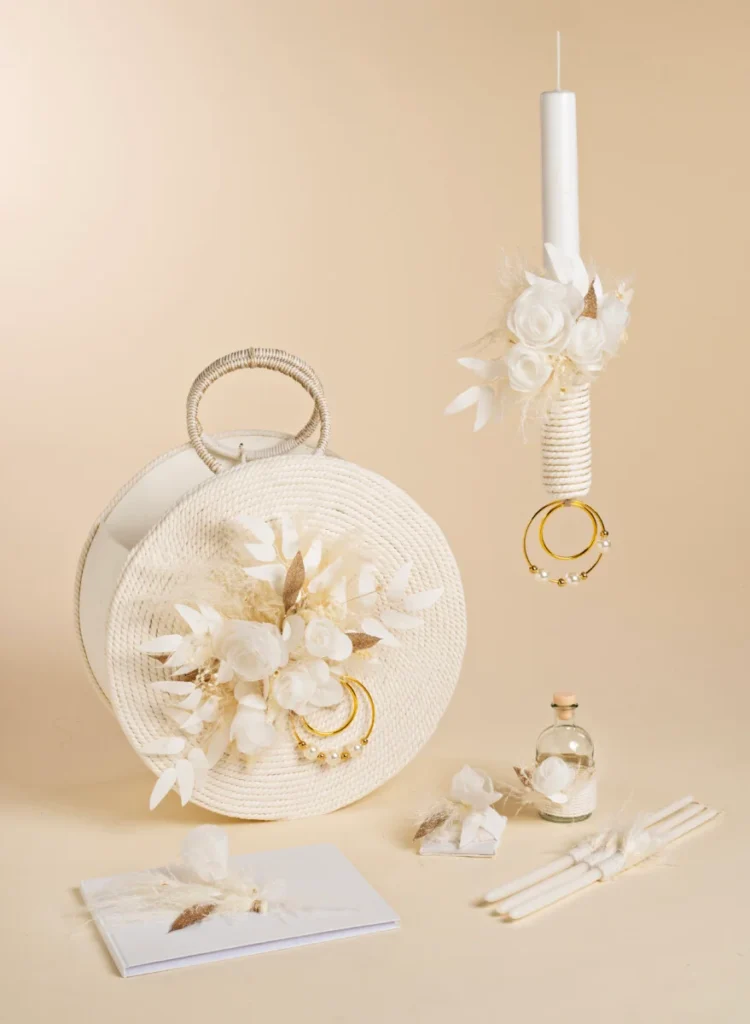 Ένα βαφτιστικό πακέτο για ξεχωριστά γούστα. Ξύλινο στρογγυλό κουτί  με φυσικά κορδόνια. Μπροστά, ένα μπουκέτο με λευκές φτέρες, φυσικά pampas και χειροποίητα υφασμάτινα λουλούδια. Χρυσά στεφανάκια με πέρλες και μεταλλικές χάντρες. Η petit λαμπάδα ξεχωρίζει για το μέγεθος και τον ιδιαίτερο στολισμό της. Σετ λαδιού, ευχολόγιο, συνδυασμένα άψογα για μία βάφτιση που θα ξεχωρίσει.