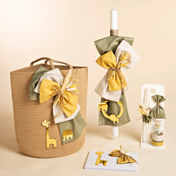 Ένα βαπτιστικό πακέτο που σε ταξιδεύει, τσάντα από δερματίνη, κάμποτ σε αποχρώσεις του φασκόμηλου και του μπεζ. Αγριολούλουδα, φυσικά κορδόνια και μονόγραμμα της επιλογής σας, petit λαμπάδα με ξύλινο διακοσμητικό στοιχείο και ένα πλούσιο μπουκέτο λουλουδιών, σετ λαδιού σε ξύλινη βάση και ευχολόγιο ασορτί.