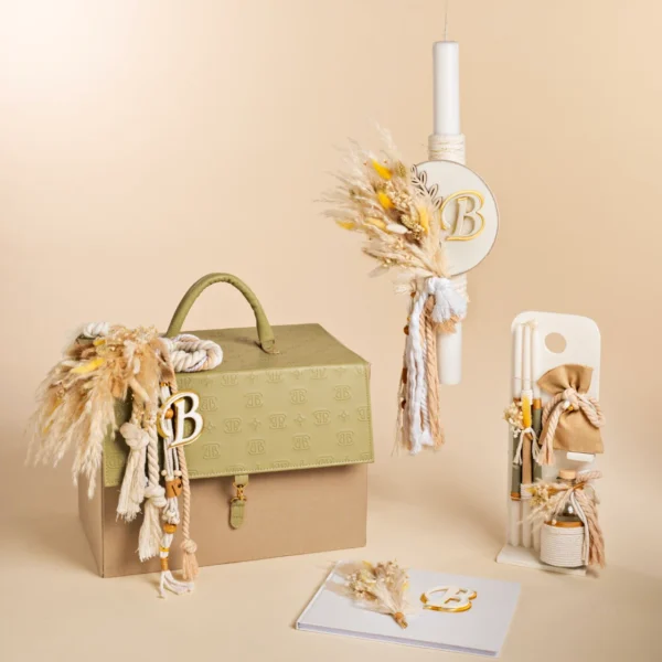 Πακέτο για ιδιαίτερα γούστα, βαρελάκι δερματίνη στο χρώμα του σαφράν και για στολισμό μια σύνθεση κόσμημα από λευκά κορδόνια, χρυσά στεφανάκια, χάντρες και λεπτομέρειες από φίλτεση. Η λαμπάδα ξεχωρίζει για το εντυπωσιακό της design, σχεδιασμένη άψογα με το βιβλίο ευχών και το σετ λαδιού.