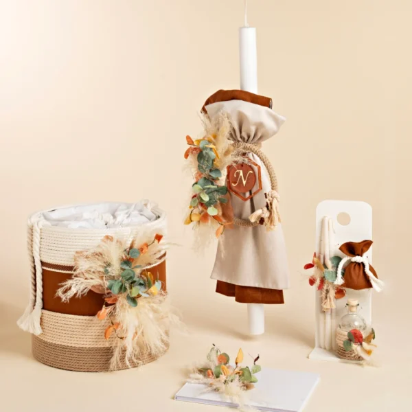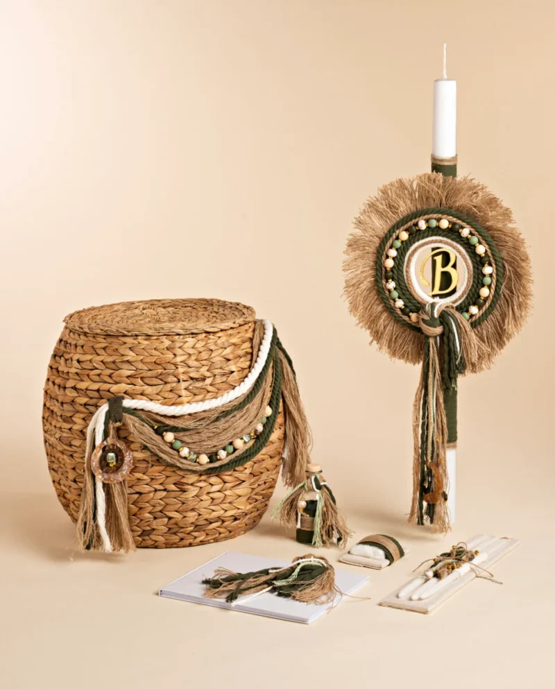 Μεγάλο ψάθινο καλάθι στολισμένο σε μποχο διάθεση με φυσικά κορδόνια και χάντρες σε λαδί και μπεζ αποχρώσεις. Λαμπάδα στα ίδια χρώματα με στρογγυλό στεφάνι και μονόγραμμα της επιλογής σας. Σετ λαδιού και ευχολόγιο ασορτί.