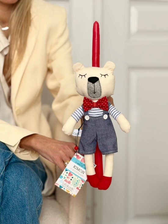Πασχαλινή λαμπάδα με χειροποίητο υφασμάτινο αρκουδάκι, ραμμένο με βαμβακερά υφάσματα.