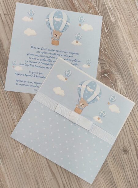 Προσκλητήριο βάπτισης με θέμα αρκουδάκι με αερόστατο.