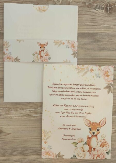 Προσκλητήριο βάπτισης με θέμα το ελαφάκι.