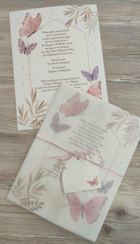 Προσκλητήριο βάπτισης με θέμα πεταλούδα.