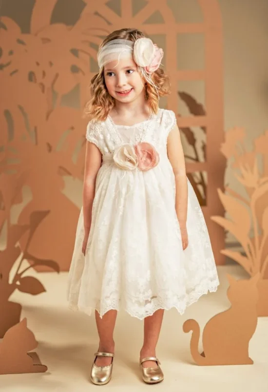 Ένα φόρεμα που αποπνέει νοσταλγική διάθεση, φτιαγμένο εξολοκλήρου από μοναδική δαντέλα σε ιβουάρ απόχρωση. Ξεχωρίζει για τις ντραπέ τιράντες από δαντέλα στο μπούστο, την υπέροχα ανοιχτή πλάτη και την πλούσια, σουρωτή φούστα. Η τούλινη ζώνη στη μέση προσφέρει τέλεια εφαρμογή και στολίζεται με δύο υπέροχα λουλούδια σε παστέλ αποχρώσεις του ροζ και του ιβουάρ. Την εμφάνιση ολοκληρώνει η τούλινη κορδέλα για τα μαλλιά, διακοσμημένη με τα ίδια χειροποίητα λουλούδια του φορέματος.