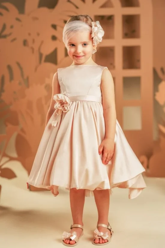 Ένα απλό αλλά αριστοκρατικό φόρεμα σε dusty pink αποχρωση, σε γραμμή princess που αποπνέει διαχρονική κομψότητα. Φτιαγμένο από ντραπαριστό σατέν ύφασμα, ξεχωρίζει για την εντυπωσιακή φούστα-ομπρέλα με την ουρά που χαρίζει υπέροχη κίνηση στο ρούχο. Το μπούστο μπροστά είναι απλό κρατώντας όλη την έκπληξη για το πίσω μέρος του φορέματος όπου φαρδιές τιράντες μαζί με έναν μεγαλοπρεπής φιόγκο στολίζουν την πλάτη. Το σύνολο ολοκληρώνεται με την τούλινη κορδέλα για τα μαλλιά διακοσμημένη με το υπέροχο χειροποίητο λουλούδι -ασορτί με αυτό του φορέματος- δημιουργώντας έναν απόλυτα αρμονικό συνδυασμό.