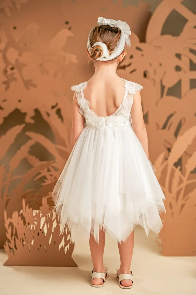 Ένα νεραϊδένιο πανέμορφο φόρεμα σε off white χρώμα, φτιαγμένο από μαλακό τούλι και γκλίτερ. Το μπούστο, ντουμπλαρισμένο στο στήθος με ύφασμα από παγιέτες, διαθέτει πολύ ανοιχτή πλάτη και στολίζεται περίτεχνα με απλικέ τούλινα λουλούδια κεντημένα με χάντρες, προσφέροντας μια αίσθηση ρομαντισμού και πολυτέλειας. Η φούστα, με την πλούσια σούρα και τις ασύμμετρες μύτες, προσδίδει κίνηση και παιχνιδιάρικο χαρακτήρα στο σύνολο. Το look ολοκληρώνεται με την τούλινη κορδέλα για τα μαλλιά, διακοσμημένη με φτερά και λουλούδι ασορτί με το φόρεμα.