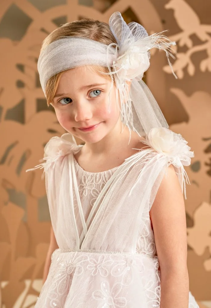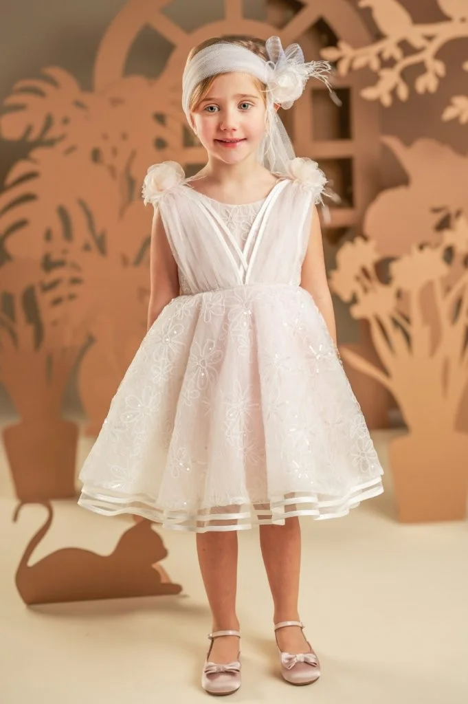 Ένα μαγευτικό φόρεμα με μοναδικό σχέδιο σε απαλή απόχρωση του κυκλάμινου , φτιαγμένο από κεντημένη δαντέλα με μαργαρίτες. Το μπούστο παίζει με τις στρώσεις και τις διαφάνειες, ενώ στους ώμους στολίζεται με χειροποίητα λουλούδια και φτερά. Η φούστα-ομπρέλα, με πολλές στρώσεις και διαφορετικά μήκη, χαρίζει όγκο και κίνηση. Το σύνολο ολοκληρώνει η τούλινη κορδέλα για τα μαλλιά, διακοσμημένη υπέροχα με φιόγκο, λουλούδι και φτερά.