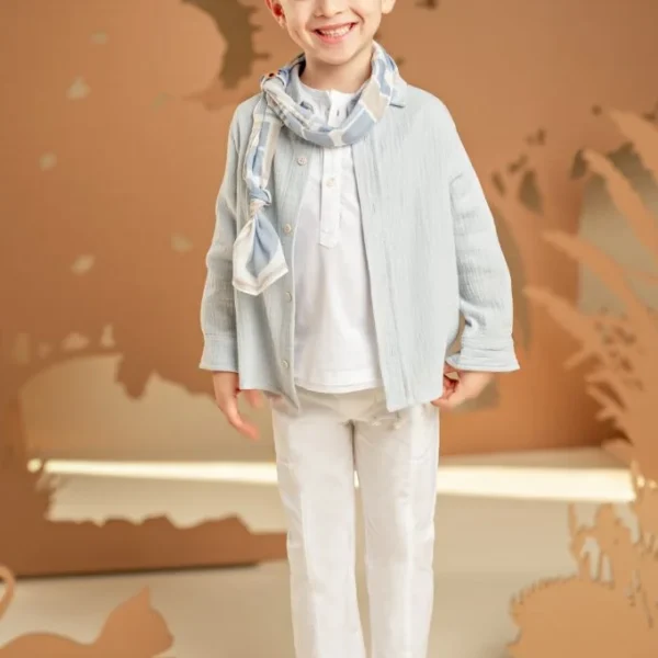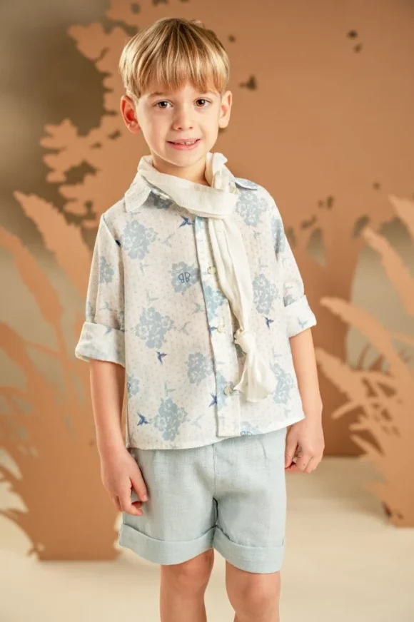 Μια φρέσκια πρόταση, ιδανική για σύγχρονες, ανάλαφρες εμφανίσεις. Αποτελείται από βερμούδα σε χαλαρή γραμμή από λινό σιελ ύφασμα και βαμβακερό πουκάμισο λευκό με φλοράλ σιελ χρώμα τύπωμα Baby Bloom exclusive. Το σύνολο ολοκληρώνεται με φουλάρι σε off white απόχρωση και ανάλογα με το στιλ που προτιμάτε, ψάθινο καπέλο ή υφασμάτινη  τραγιάσκα .