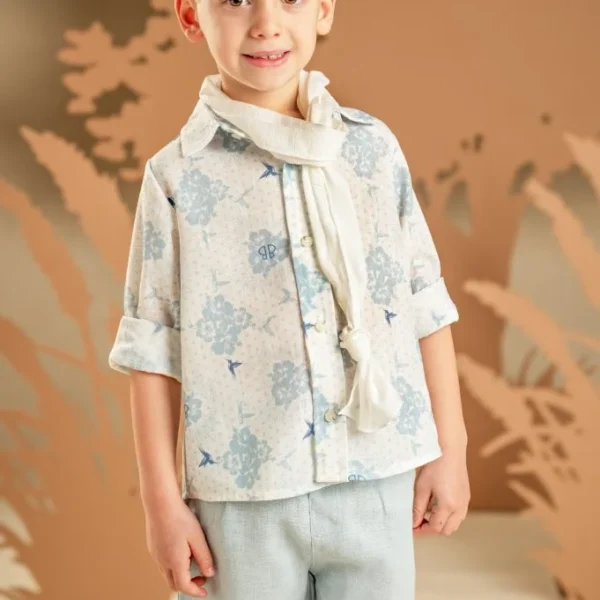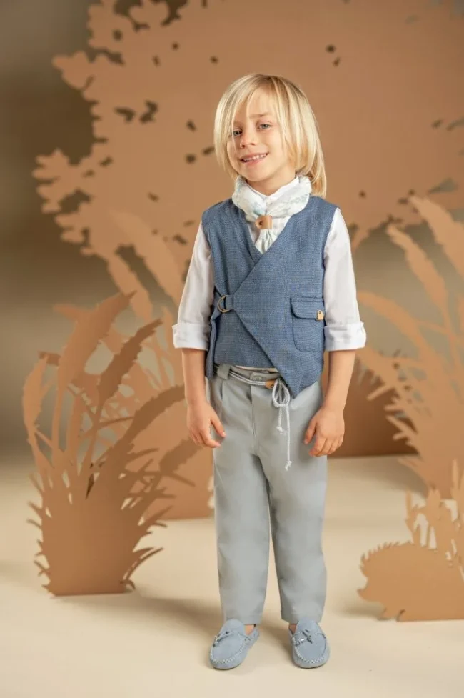 Ένα υπέροχο σετ  που συνδυάζει άνεση και σύγχρονο design. Παντελόνι από Tencel-cotton-linen ύφασμα σε σιελ-γκρι απόχρωση με ιδιαίτερο κόψιμο στο πίσω μέρος και γιλέκο σε μπλε βαμβακερό μελανζέ ύφασμα με λοξό ασύμμετρο κόψιμο και εξωτερικό τσεπάκι. Το βαμβακερό πουκάμισο σε off white χρώμα με τον ξεχωριστό Mao γιακά φωτίζει το σύνολο ενώ το εμπριμέ φουλάρι Baby Bloom exclusive σε σιελ αποχρώσεις ολοκληρώνουν όμορφα το look. Το σετ περιλαμβάνει ζώνη κορδόνι και επιλογή ανάμεσα σε ψάθινο καπέλο ή υφασμάτινη τραγιάσκα.