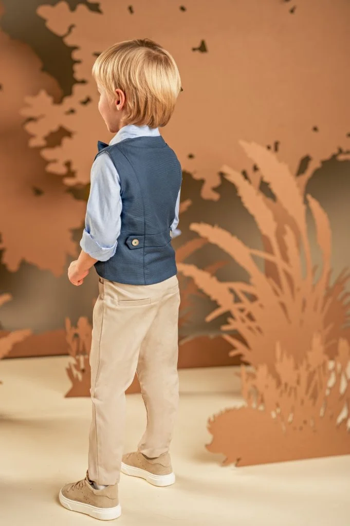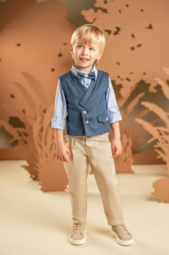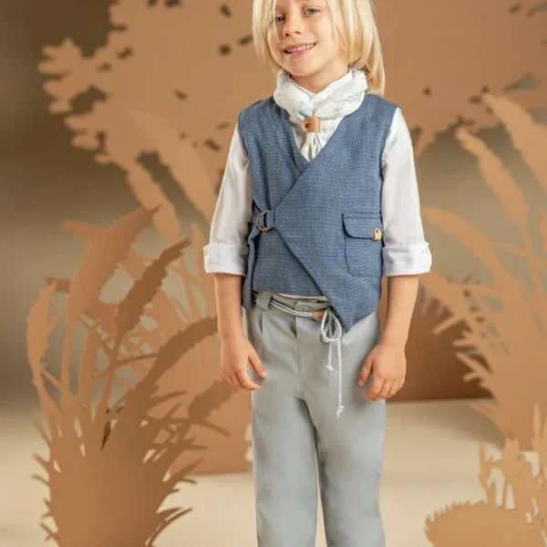 Ένα σύνολο που συνδυάζει κομψότητα και άνεση με μοναδικές λεπτομέρειες. Το δίπιετο βαμβακερό παντελόνι με την έξτρα λοξή ζώνη σε μπεζ απόχρωση και το σταυρωτό γιλέκο με τον γιακά κιμονό σε μπλε χρώμα από βαμβακερό μελανζέ ύφασμα δημιουργούν ένα υπέροχο αποτέλεσμα . Συνδυάζονται τέλεια με το σιελ βαμβακερό πουκάμισο και το μπλε παπιγιόν, ενώ για την τελική πινελιά, επιλέξτε ανάμεσα σε ψάθινο καπέλο ή υφασμάτινη τραγιάσκα, σύμφωνα με το προσωπικό σας στυλ.