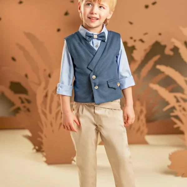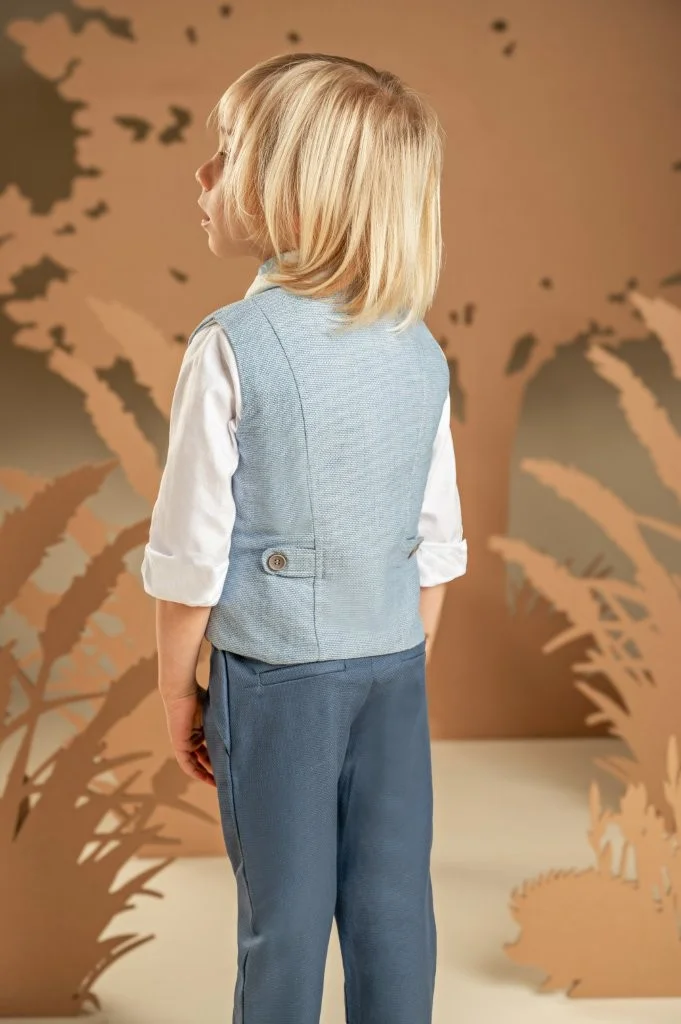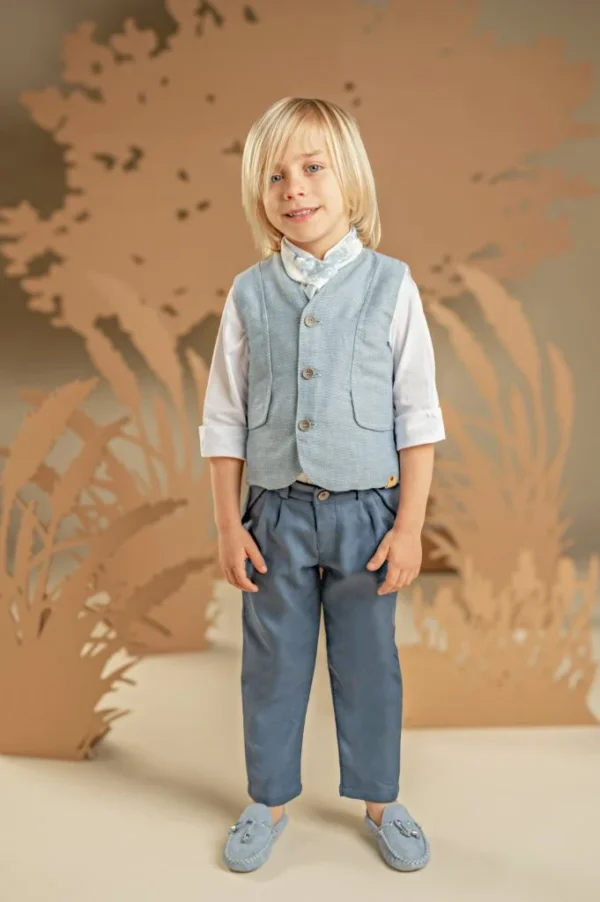 Μια διαχρονική πρόταση με μοντέρνες λεπτομέρειες για τους μικρούς μας κυρίους. Παντελόνι από μπλε βαμβακερό καμβά και γιλέκο από μελανζέ βαμβακερό σιελ ύφασμα σε κλασική γραμμή, το οποίο ξεχωρίζει για τα έξυπνα κοψίματα που καταλήγουν σε τσέπες, Το λευκό βαμβακερό πουκάμισο με Mao γιακά και το φουλάρι σε σιελ αποχρώσεις με exclusive τύπωμα Baby Bloom ολοκληρώνουν ιδανικά το σύνολο. Για την τελική πινελιά, επιλέξτε ανάμεσα σε ψάθινο καπέλο ή υφασμάτινη τραγιάσκα, ανάλογα με το προσωπικό σας στυλ