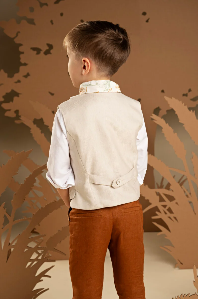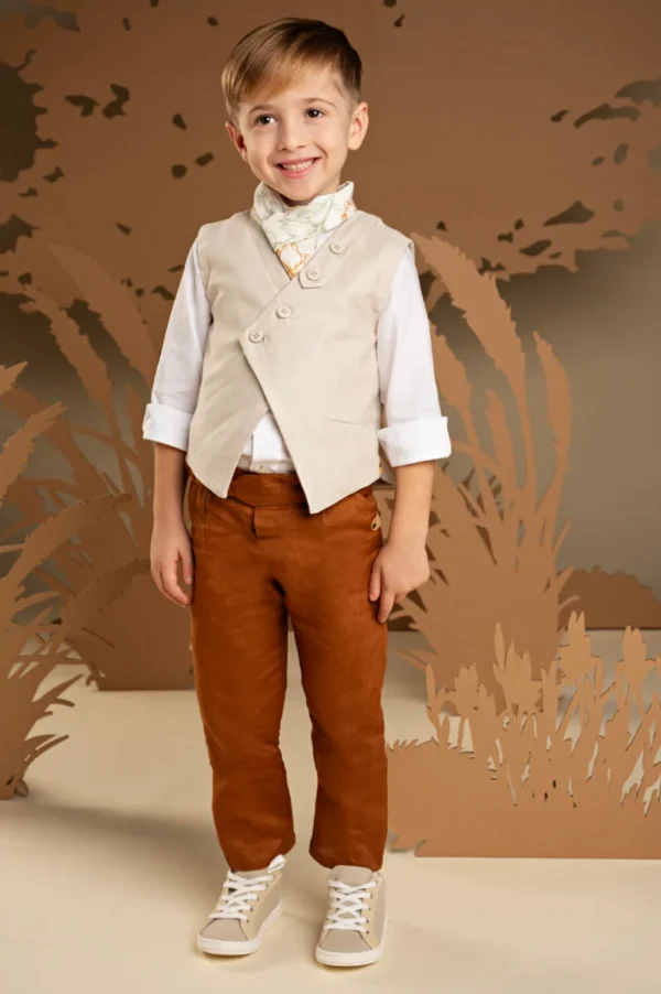 Μια πρόταση που ξεχωρίζει για τον όμορφο χρωματικό συνδυασμό και τις ιδιαίτερες λεπτομέρειες στον σχεδιασμό. Το παντελόνι από λινό ύφασμα σε απόχρωση σαφράν, δένει υπέροχα με το γιλέκο από μπεζ Tencel-cotton-linen ύφασμα με το λοξό κούμπωμα και τις ξεχωριστές  λεπτομέρειες . Το λευκό βαμβακερό πουκάμισο με Mao γιακά και το φλοράλ φουλάρι σε αποχρώσεις μέντας και σαφράν με exclusive τύπωμα Baby Bloom ολοκληρώνει το look με στιλ. Για την τελευταία πινελιά, επιλέξτε ανάμεσα σε ψάθινο καπέλο ή υφασμάτινη τραγιάσκα, σύμφωνα με το προσωπικό σας στυλ.