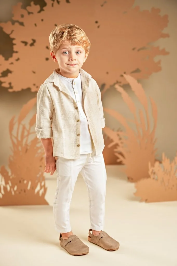 Ένα σύνολο με χαλαρή και σύγχρονη αισθητική, ιδανικό για όσους αγαπούν τις ξεχωριστές εμφανίσεις. Το σετ αποτελείται από παντελόνι σε λευκή καμπαρντίνα με εντυπωσιακά κοψίματα μπροστά και πίσω, συνδυασμένο με 100% λινή λευκή τουνίκ με πατιλέτα για άνεση και δροσιά. Το πουκάμισο από μπεζ υφαντό ύφασμα φοριέται από πάνω, ολοκληρώνοντας το layered look. Για την τελική πινελιά, επιλέξτε ανάμεσα σε ψάθινο καπέλο ή υφασμάτινη τραγιάσκα, ανάλογα με το προσωπικό σας στυλ.