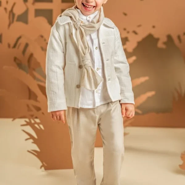 Για τους μικρούς κυρίους που αγαπούν το στυλ και τη λεπτομέρεια, αυτό το σετ υπόσχεται να εντυπωσιάσει σε κάθε ιδιαίτερη περίσταση. Το δίπιετο παντελόνι με το λοξό κούμπωμα συνδυάζεται τέλεια με το σταυρωτό γιλέκο και τα δύο από tencel-cotton-linen ύφασμα σε ανοιχτή μπεζ απόχρωση. Το off white βαμβακερό πουκάμισο με τον ιδιαίτερο Mao γιακά μαζί με το φουλάρι από τσαλακωμένο βουάλ σε λευκό χρώμα συμπληρώνουν ιδανικά το look. Για το τελικό στυλ μπορείτε να επιλέξετε ανάμεσα στο ψάθινο καπέλο ή την υφασμάτινη τραγιάσκα, ανάλογα με την προτίμησή σας.