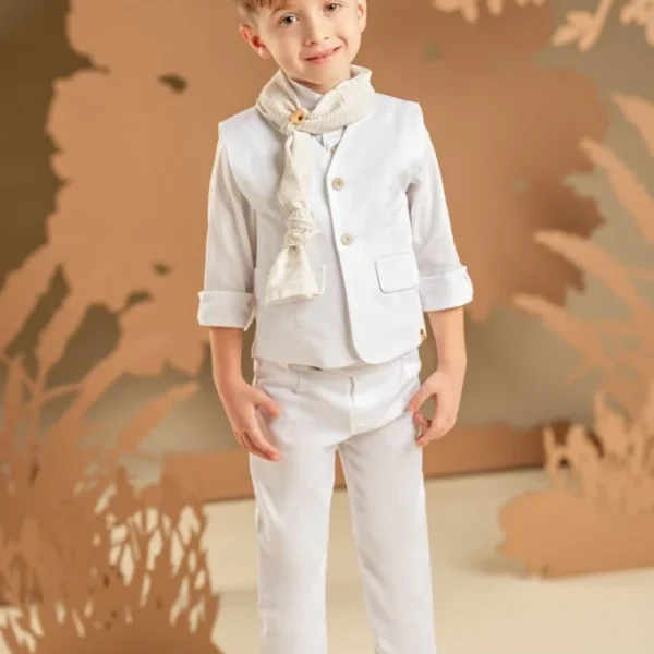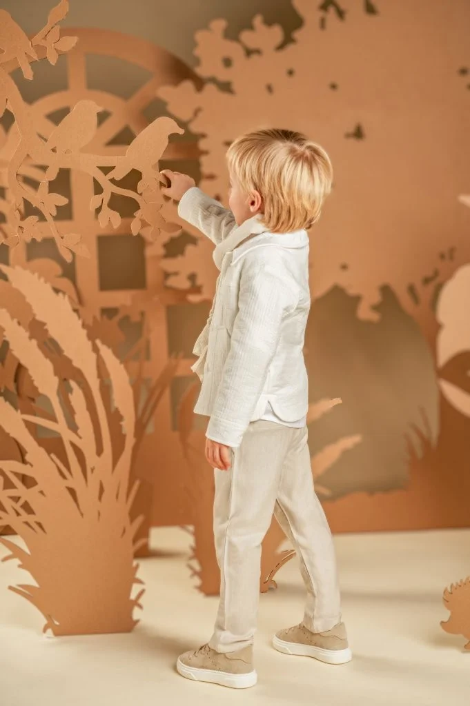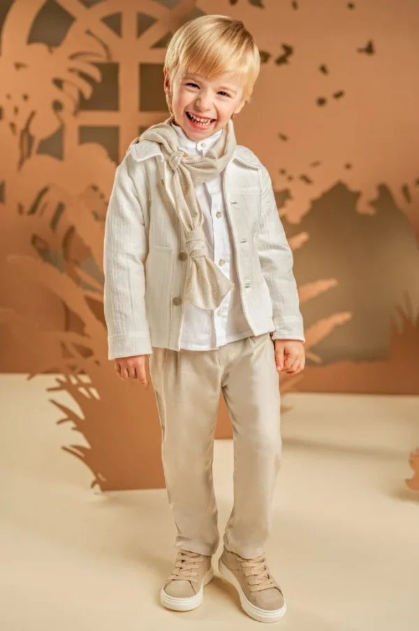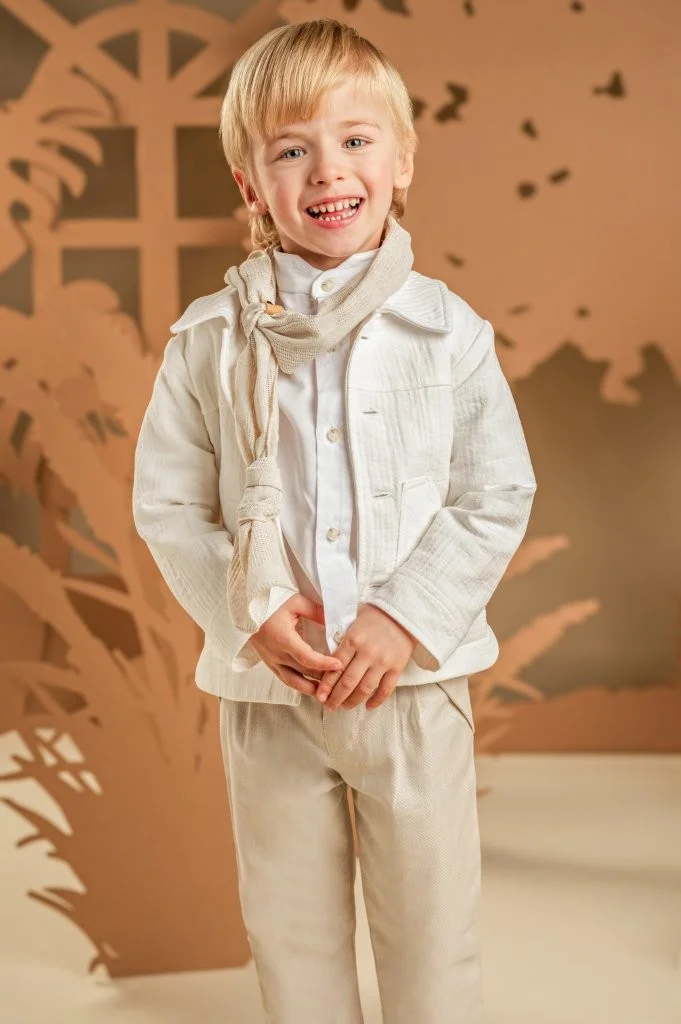 Ένα σύνολο φωτεινό και μοναδικό  για  ξεχωριστές εμφανίσεις. Το σετ περιλαμβάνει παντελόνι από τtwill Tencel-cotton-linen ύφασμα σε μπεζ αποχρώσεις και  μπουφανάκι με γιακά και εξωτερικές τσέπες από γκοφρέ βαμβακερό ύφασμα σε off white χρώμα. Το λευκό βαμβακερό πουκάμισο με τον ιδιαίτερο Mao γιακά ολοκληρώνει χρωματικά το look, ενώ το μακρόστενο υφαντό φουλάρι σε μπεζ αποχρώσεις προσθέτει μια διακριτική, ξεχωριστή πινελιά. Για την τελική λεπτομέρεια, επιλέξτε ανάμεσα σε ψάθινο καπέλο ή υφασμάτινη τραγιάσκα, σύμφωνα με το προσωπικό σας στυλ.