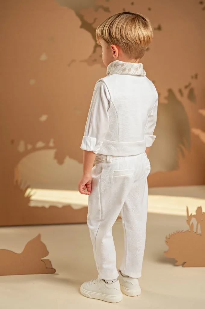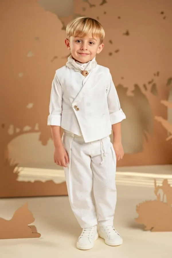 Ένα σετ ιδανικό για τους μικρούς κυρίους με ξεχωριστό γούστο και σύγχρονο στυλ. Το baggy παντελόνι με ιδιαίτερες reverse πιέτες και ζώνη από κορδονέτο, σε συνδυασμό με το σταυρωτό γιλέκο με λοξό κούμπωμα και μονό πέτο, και τα δύο από βαμβακερό ύφασμα σε off white απόχρωση, δημιουργούν ένα μοναδικό αποτέλεσμα. Το βαμβακερό πουκάμισο με ιδιαιτερο Mao γιακά και το exclusive εμπριμέ φουλάρι Baby Bloom σε λευκή-μπεζ απόχρωση ολοκληρώνουν το look. Για την τελευταία πινελιά, επιλέξτε ανάμεσα σε ψάθινο καπέλο ή υφασμάτινη τραγιάσκα, ανάλογα με το προσωπικό σας στιλ.